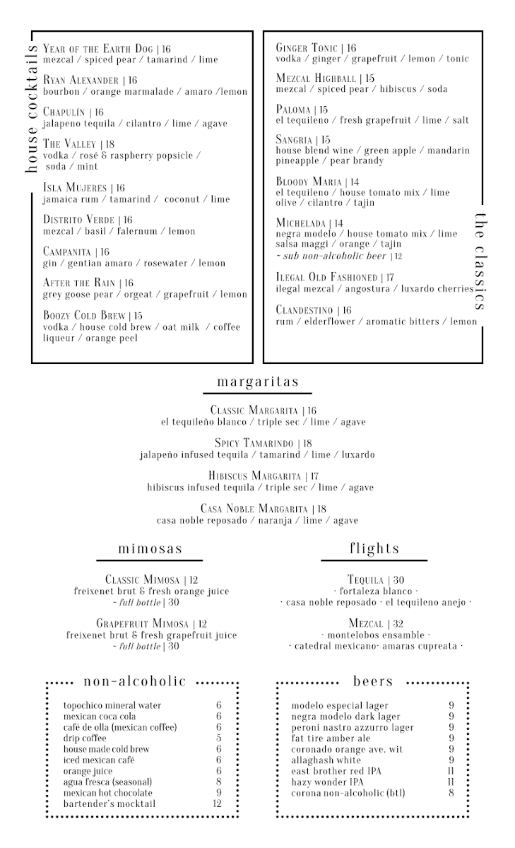 Brunch Menu: This section features classic and creative brunch items such as Huevos Rancheros, Chilaquiles, and a Fried Egg Sandwich. Many dishes incorporate traditional Mexican ingredients like huitlacoche tortillas, chile de árbol-guajillo salsa, and queso fresco, alongside familiar brunch staples. Sides include options like handcut fries, refried beans, chiles toreados, and various sausages including vegan alternatives.