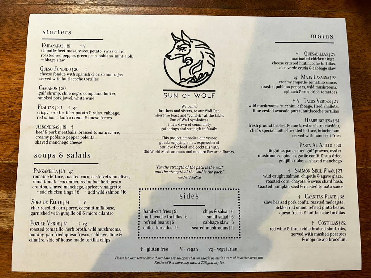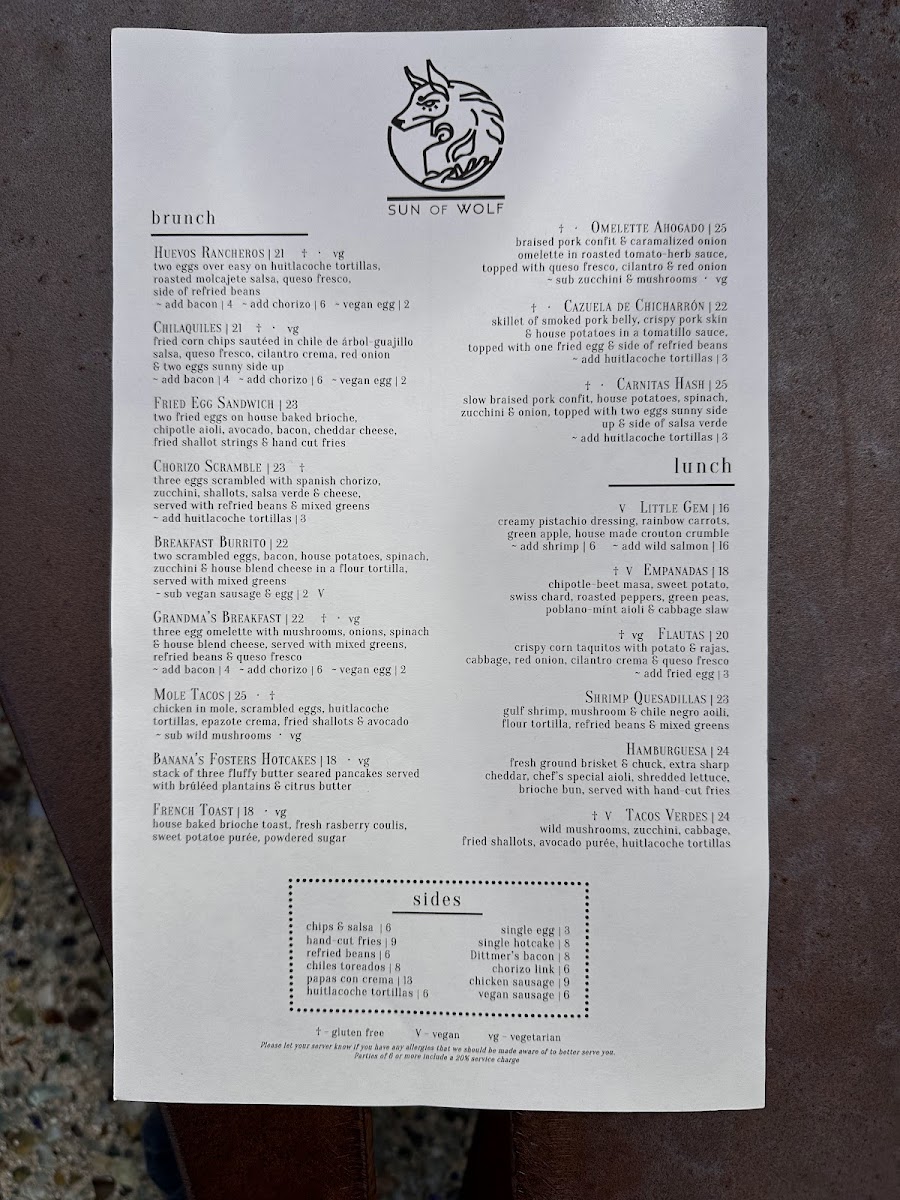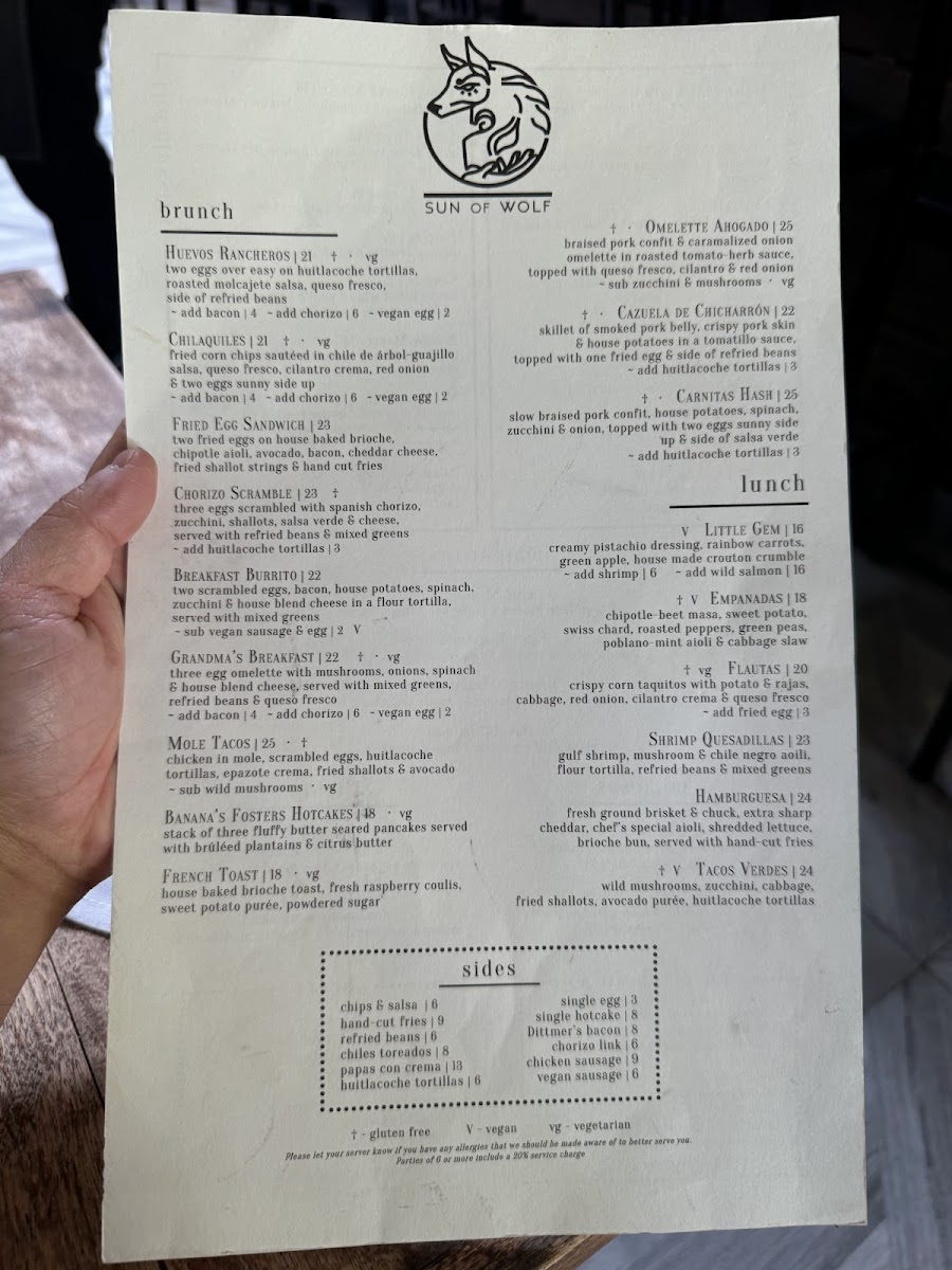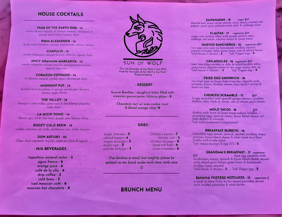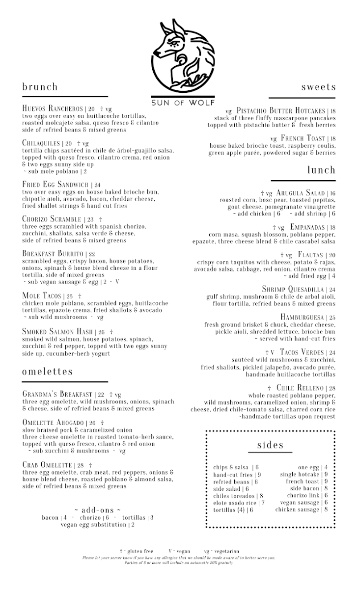 The menu at SUN of WOLF offers a diverse selection of dishes blending Mexican, Californian, and fusion influences, suitable for brunch and lunch occasions. It is organized into several key groups to accommodate a variety of preferences and dining needs.